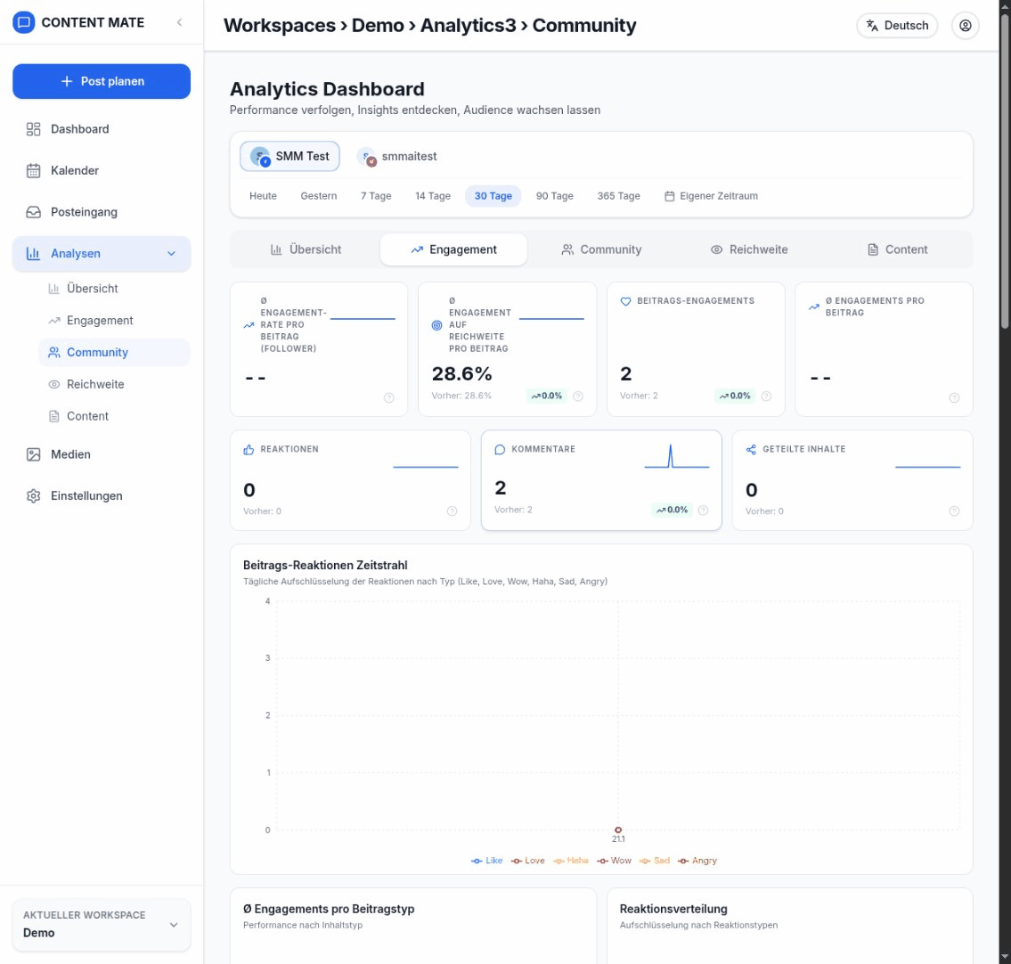 Der Engagement-Bereich im Analytics Dashboard zeigt Ihnen, wie Ihre Community mit Ihrem Content interagiert. Hier finden Sie detaillierte Aufschlüsselungen von Reaktionen, Kommentaren, Shares und Klicks.