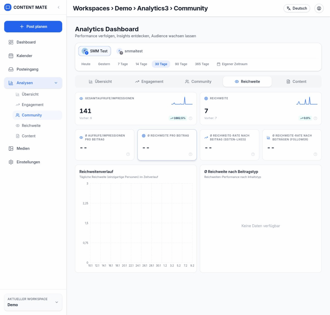 Öffnen Sie Analysen im Seitenmenü und klicken Sie auf den Tab Reichweite. Alternativ wählen Sie Reichweite direkt im Untermenü der Seitenleiste.